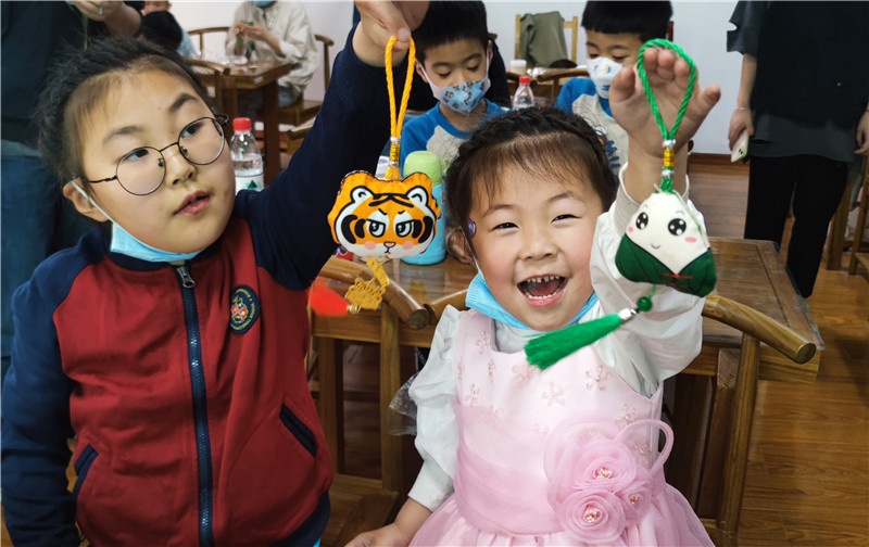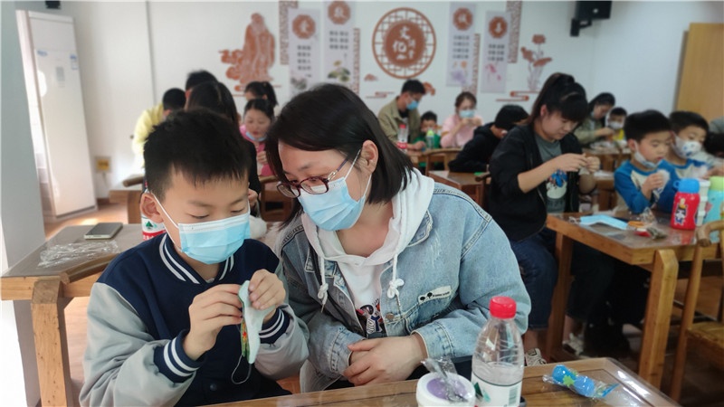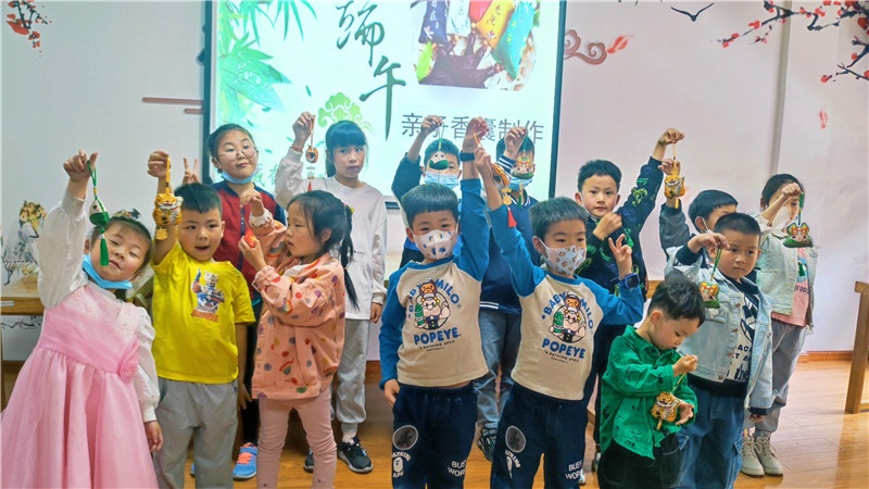 悠悠香囊味,浓浓端午情。谁说针线是女生的专利,男孩子照样帮妈妈穿针引线,不一会儿,花色不同、图案精美的香囊雏形就完成了,亲子们把中药包放入缝制好的香囊中,串上玲珑剔透的珠子,挂上色彩缤纷的流苏,一个个饱满芳香的中药香囊就制作完成了。端午节习俗,传递的是文化,传递的是感情。一个简单的香囊不仅增加传统节日的氛围,更有利于亲子增进情感,同时培养了孩子们的动手能力和创造力,还进一步了解了中华传统文化。在小朋友心中埋下了爱国主义的种子,厚植爱国主义情怀,引导他们成长为新时代“四有青年”。