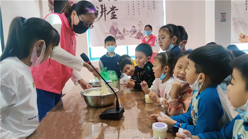 提及冰淇淋,现场的小朋友一个个兴奋得欢呼雀跃。商场里出售的冰淇淋中多含有较多的添加剂,如何给孩子制作一款无添加剂的冰淇淋成了这堂亲子互动课的目的。群益村美食老师现场讲解打发鸡蛋及鸡蛋牛奶混合液的过程,演示打发淡奶油、搅拌混合,加入果酱等改变口味的方法和分装小瓶等步骤。期间大家认真听讲解,小朋友们眼睛牢牢地盯着讲台,仔细观察每一个步骤,还时不时地向美食老师发问,兴致高涨。孩子们一边品尝着冰淇淋,一边在自己的冰淇淋罐盒上贴上自己所爱口味的标签后让美食老师装满刚做的冰淇淋,跑前跑后忙得不亦乐乎!